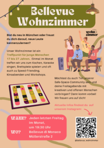 Unser Wohnzimmer ist ein Treffpunkt für junge Menschen im Alter von 17 bis 27 Jahren. Ein Mal in Monat kommen wir zusammen um gemeinsam zu kochen, Karaoke zu singen, Brettspiele zu spielen. Speed-Friending Events, Kino-Abende und Workshops sind oft ein Teil von unseren Treffen.