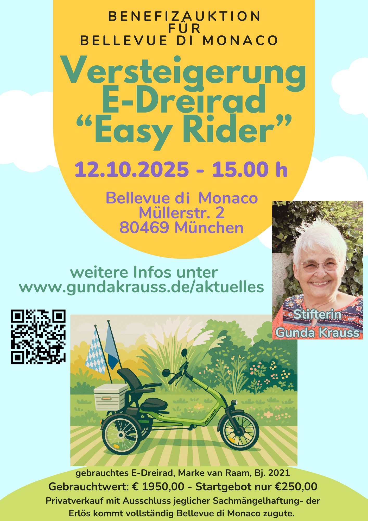«Mein Easy Rider Dreirad hat mich jahrelang begleitet und mir gezeigt: Mobilität kennt kein Alter. Es steht für Freiheit, Sicherheit und Begegnungen. Jetzt soll es weiterziehen – und gleichzeitig Menschen helfen, die Chancen und Unterstützung brauchen. Am 12. Oktober soll es für einen guten Zweck unter den Hammer kommen.»