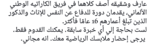 Аріф і його брат Азіф проводять курс самозахисту для людей віком від 16 років. Обидва входять до складу національної збірної команди Німеччини з карате. Тобі не потрібно нічого знати, просто завітай. Прохання мати при собі спортивні речі. Це нічого не коштує.