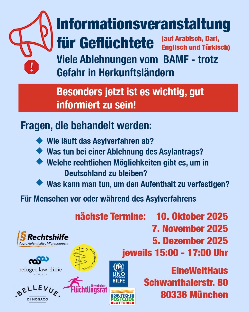 Hier helfen Rechtsanwälte bei Fragen zu Asyl und Aufenthalt. Bitte bringe alle Briefe und Dokumente mit. Die Beratung ist kostenlos.