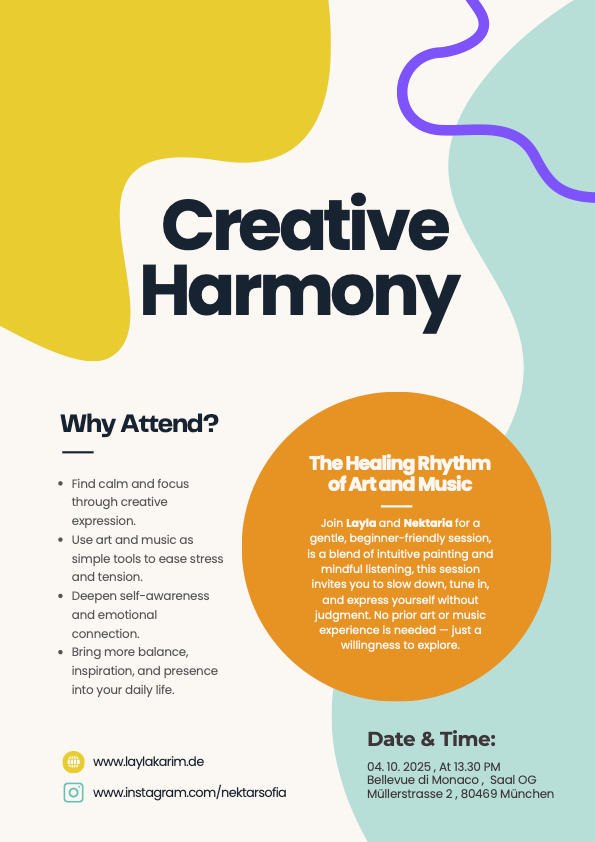 Entdecke in Creative Harmony die heilsame Verbindung von Kunst und Musik – ein achtsamer Workshop, der dir Ruhe, Inspiration und innere Balance schenkt.